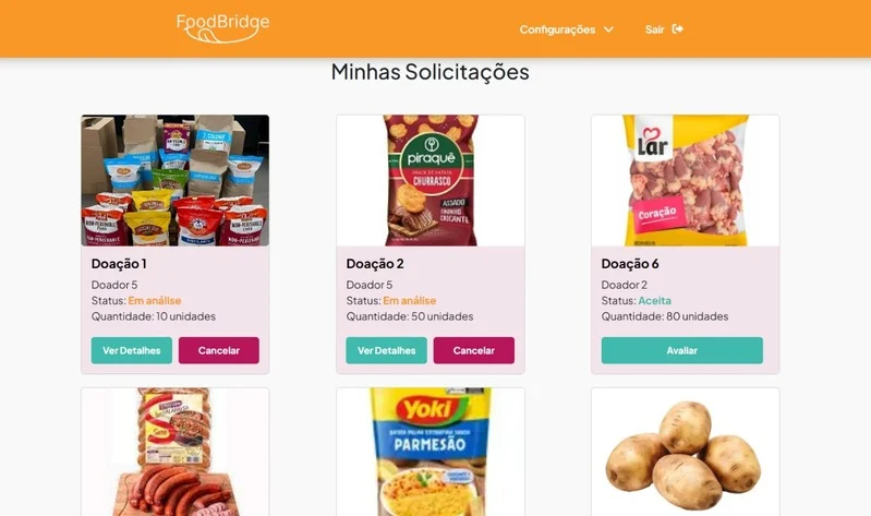 Projeto FoodBridge desenvolvido em time. Uma plataforma de conexão entre empresas e instituições sem fins lucrativos para doação de alimentos. Contribui para o desenvolvimento de funcionalidades front-end e integrações back-end, utilizando JavaScript, Node.js, Spring Boot, PostgreSQL, CSS e HTML.